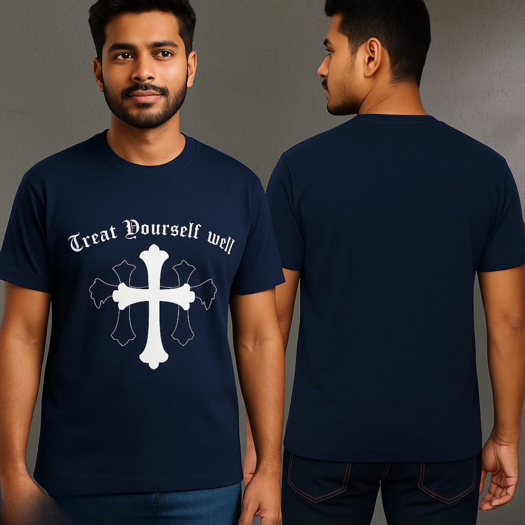Elevate your everyday look with this stylish Regular Fit Cross Design T-Shirt. Featuring a minimal yet bold cross print, this tee is perfect for those who prefer a clean, edgy style. Crafted from soft, breathable fabric, it offers all-day comfort and durability. Available in Black and Navy Blue, and sizes S to XL, it’s a versatile pick for casual outings, layering, or daily wear.