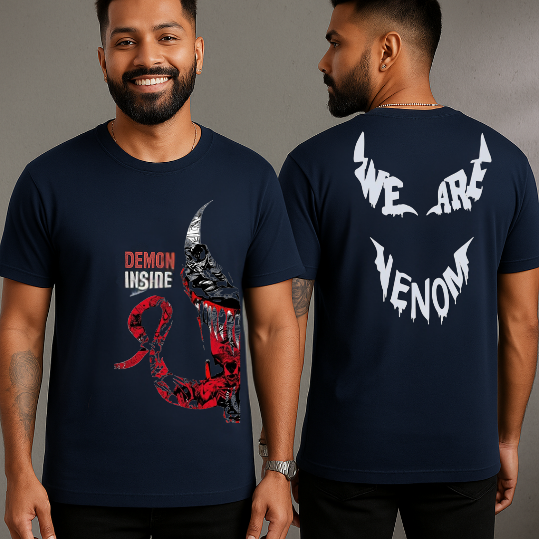 Unleash your bold side with this Regular Fit Venom T-Shirt, inspired by the iconic Marvel anti-hero. Featuring a powerful and edgy Venom design, this tee is made for fans who love sharp style and standout graphics. Crafted from soft, breathable fabric, it offers all-day comfort without compromising on attitude. Available in Black, Navy Blue, and White, and sizes S to XL, it’s perfect for casual outings or comic-inspired streetwear.